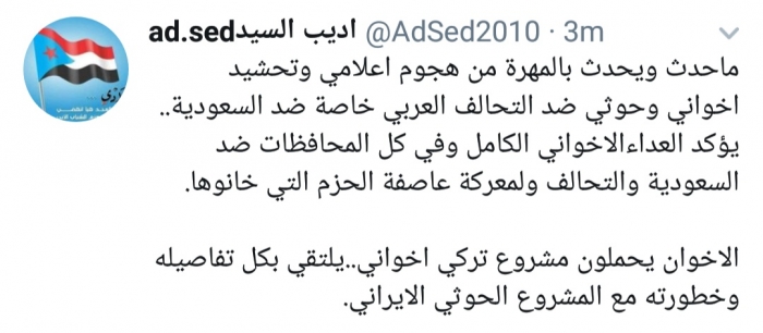 وكتب السيد، في تغريدة له عبر موقع التواصل الاجتماعي تويتر، ما حدث ويحدث بالمهرة من هجوم إعلامي وتحشيد إخواني وحوثي ضد التحالف العربي خاصة ضد السعودية يؤكد العداء الإخواني الكامل وفي كل المحافظات ضد السعودية والتحالف ولمعركة عاصفة الحزم التي خانوها".