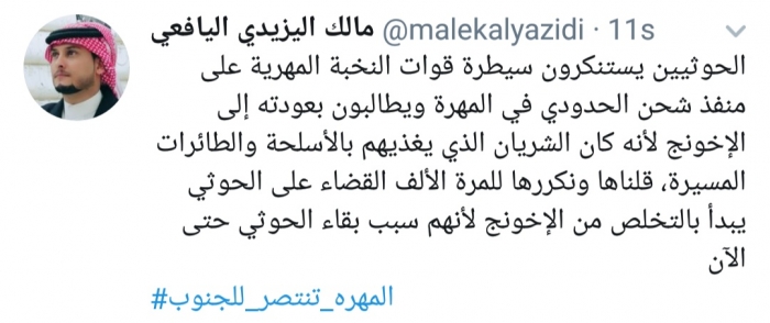 وكتب اليافعي، في تغريدة له على موقع التواصل الاجتماعي تويتر، تابعها المشهد العربي: "الحوثيون يستنكرون سيطرة قوات النخبة المهرية على منفذ شحن الحدودي في المهرة ويطالبون بعودته إلى الإخونج لأنه كان الشريان الذي يغذيهم بالأسلحة والطائرات المسيرة".