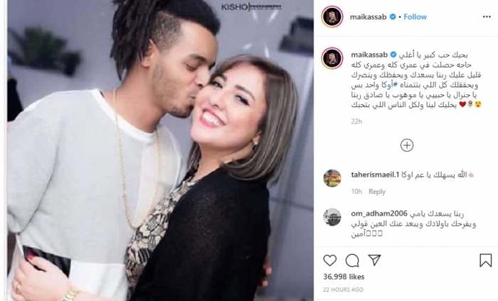 وعلقت مي على الصورة: "بحبك حب كبير يا أغلي حاجه حصلت في عمري كله، وعمري كله قليل عليك، ربنا يسعدك ويحفظك وينصرك ويحققلك كل اللي بتتمناه، أوكا واحد بس يا جنرال يا حبييي يا موهوب يا صادق ربنا يخليك لينا ولكل الناس اللي بتحبك".