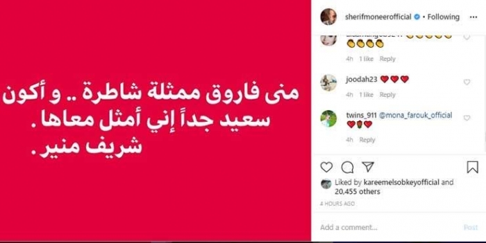 وكتب شريف منير عبر حسابه على إنستجرام: "منى فاروق ممثلة شاطرة وأكون سعيد لو اشتغلت معاها".