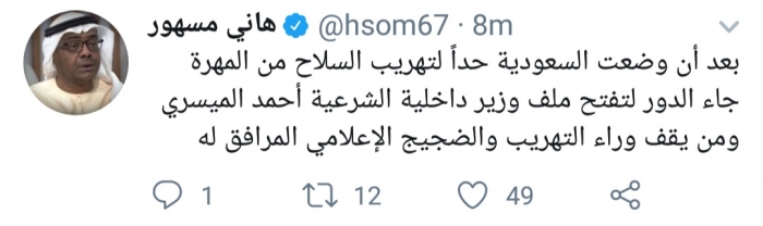 وكتب مسهور، في تغريدة له عبر موقع التواصل الاجتماعي تويتر، تابعها المشهد العربي: "بعد أن وضعت السعودية حداً لتهريب السلاح من المهرة جاء الدور لتفتح ملف وزير داخلية الشرعية أحمد الميسري ومن يقف وراء التهريب والضجيج الإعلامي المرافق له".
