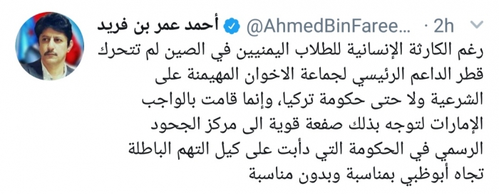 وكتب بن فريد، في تغريدة له عبر موقع التواصل الاجتماعي تويتر، تابعها المشهد العربي: "رغم الكارثة الإنسانية للطلاب اليمنيين في الصين لم تتحرك قطر الداعم الرئيسي لجماعة الإخوان المهيمنة على الشرعية ولا حتى حكومة تركيا".