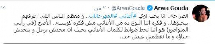 وكتبت: "الصراحة.. أنا بحب أوي أغاني المهرجانات، ومعظم الناس اللي أعرفهم بيحبوها، وفكرة إننا نمنع النوع ده من الأغاني مش فكرة كويسة".