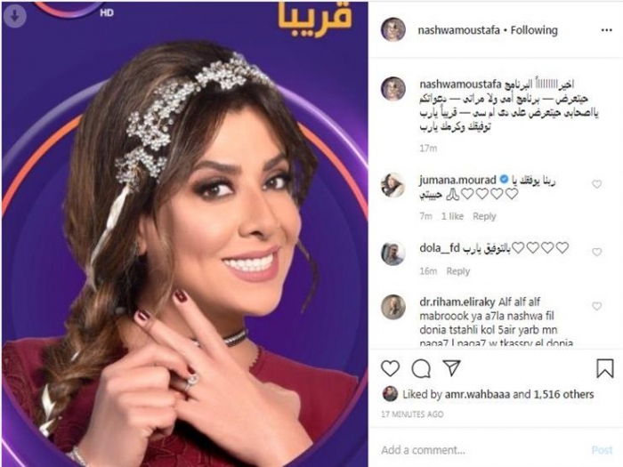 ونشرت نشوى، بوستر البرنامج عبر حسابها على"إنستجرام"، وعلقت: "أخيرا البرنامج هيتعرض، برنامج (أمي ولا مراتي)، دعواتكم يا أصحابى هيتعرض على (دى ام سى)، قريبا يارب توفيقك وكرمك يا رب".