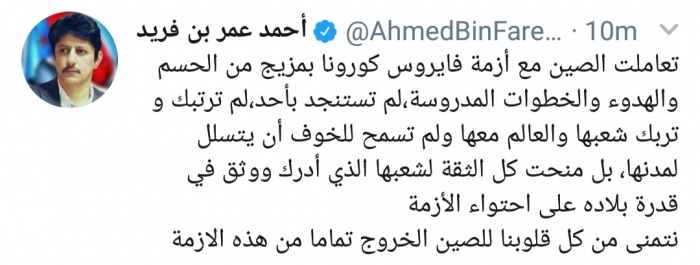 وكتب بن فريد، في تغريدة له على موقع التواصل الاجتماعي تويتر، تابعها المشهد العربي: "تعاملت الصين مع أزمة فيروس كورونا بمزيج من الحسم والهدوء والخطوات المدروسة".