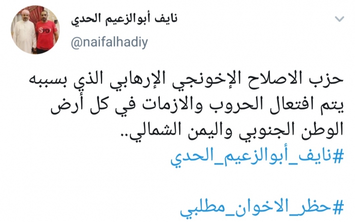 وكتب الحدي، في تغريدة له عبر موقع التواصل الاجتماعي تويتر، تابعها المشهد العربي: "حزب الإصلاح الإخونجي الإرهابي الذي بسببه يتم افتعال الحروب والأزمات في كل أرض الوطن الجنوبي واليمن الشمالي".