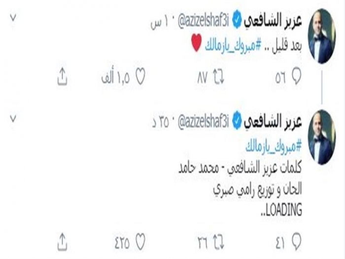 وكتب الشافعي عبر حسابه الشخصي بموقع "تويتر": "مبروك يا زمالك، من كلمات عزيز الشافعي ومحمد حامد، وألحان و توزيع رامي صبري".