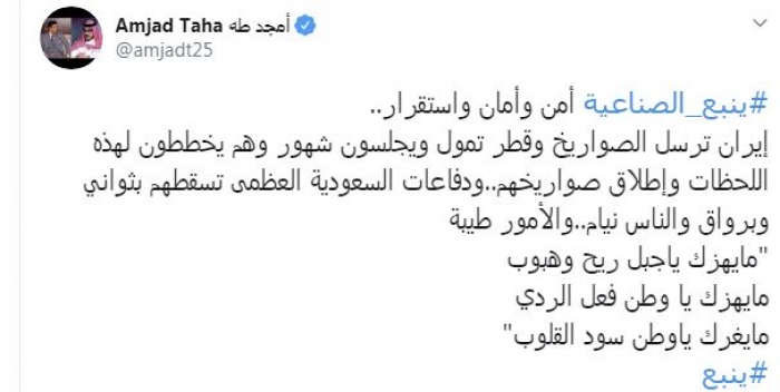 وقال في تغريدة عبر "تويتر" رصدها "المشهد العربي": "ينبع الصناعية أمن وأمان واستقرار.. إيران ترسل الصواريخ وقطر تمول ويجلسون شهور وهم يخططون لهذه اللحظات وإطلاق صواريخهم..ودفاعات السعودية العظمى تسقطهم بثواني وبرواق والناس نيام..والأمور طيبة ما يهزك ياجبل ريح وهبوب ما يهزك يا وطن فعل الردي ما يغرك ياوطن سود القلوب".