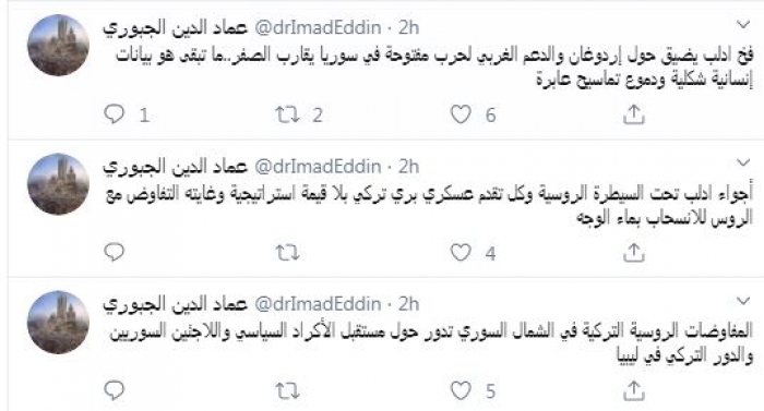 وكتب في تغريدات عبر "تويتر" رصدها "المشهد العربي": "المفاوضات الروسية التركية في الشمال السوري تدور حول مستقبل الأكراد السياسي واللاجئين السوريين والدور التركي في ليبيا".