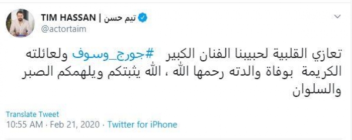 وكتب الفنان تيم حسن "تعازي القلبية لحبيبنا الفنان الكبير جورج وسوف ولعائلته الكريمة، بوفاة والدته رحمها الله، الله يثبتكم ويلهمكم الصبر والسلوان".