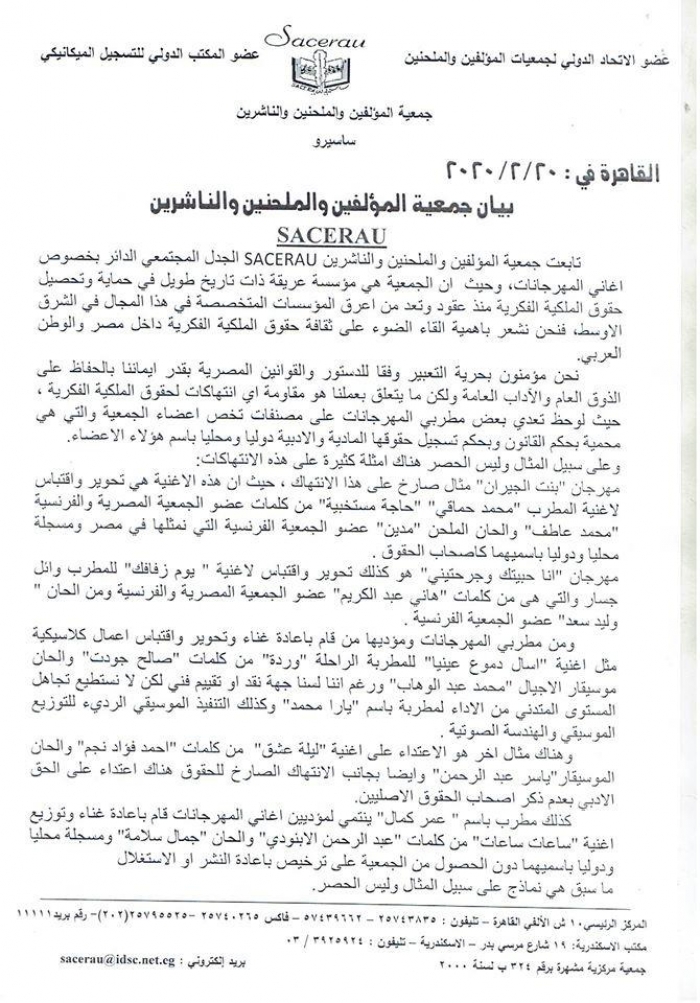 وكشفت الجمعية في بيان أصدرته أمس الخميس، عن أغانٍ لمهرجانات تعدى مطربوها، على حقوق المبدعين، مشيرة إلى أن مهرجان "بنت الجيران" مثال صارخ على هذا الانتهاك، إذ تعتبر الأغنية تحويرًا واقتباسًا لأغنية محمد حماقي "حاجة مستخبية"، من كلمات عضو الجمعية الشاعر محمد عاطف، وألحان الملحن "مدين" عضو الجمعية الفرنسية، ومسجلة محليا ودوليا باسمهما كأصحاب للحقوق.
