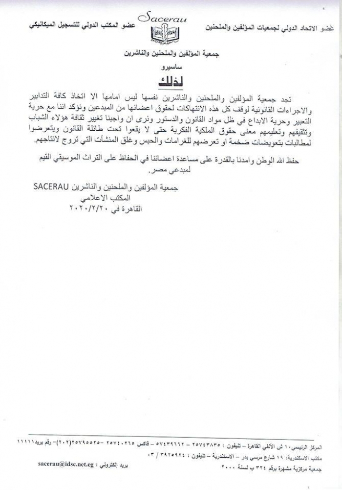 وأشار البيان، إلى أن التعدي وصل إلى الأغاني الكلاسيكية، ومنها "اسال دموع عينيا" للفنانة وردة، من كلمات صالح جودت، وألحان الموسيقار محمد عبدالوهاب، ووصفت أداء المطربة التي تقدمها "يارا محمد" بالمتدني، مشيرة إلى وجود انتهاكٍ صارخٍ أيضا لحقوق الشاعر أحمد فؤاد نجم والملحن الموسيقار ياسر عبدالرحمن، وأغنيتهما "حالة عشق".
