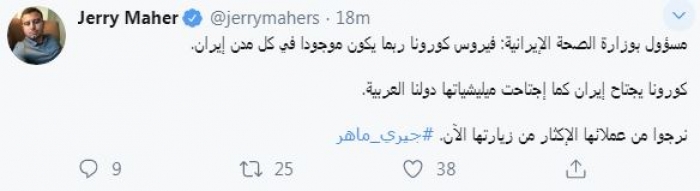 وكتب في تغريدة عبر "تويتر" رصدها "المشهد العربي": "مسؤول بوزارة الصحة الإيرانية: فيروس كورونا ربما يكون موجودًا في كل مدن إيران. كورونا يجتاح إيران كما اجتاحت ميليشياتها دولنا العربية. نرجوا من عملائها الإكثار من زيارتها الآن".