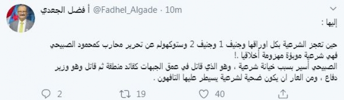 وقال في تغريدة عبر "تويتر" رصدها "المشهد العربي": "حين تعجز الشرعية بكل أوراقها وجنيف 1 وجنيف 2 وستوكهولم عن تحرير محارب كمحمود الصبيحي فهي شرعية موبؤة مهزومة أخلاقياً".