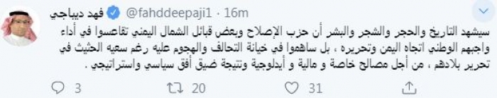 وقال في تغريدة عبر "تويتر" رصدها "المشهد العربي": "التاريخ والحجر والشجر والبشر أن حزب الإصلاح وبعض قبائل الشمال اليمني تقاعسوا في أداء واجبهم الوطني اتجاه اليمن وتحريره، بل ساهموا في خيانة التحالف والهجوم عليه رغم سعيه الحثيث في تحرير بلادهم، من أجل مصالح خاصة ومالية وأيدلوجية ونتيجة ضيق أفق سياسي واستراتيجي".