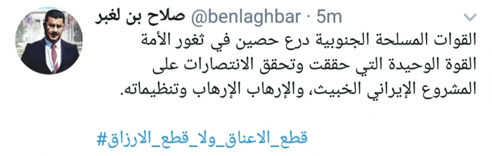 وكتب بن لغبر، في تغريدة له عبر موقع التواصل الاجتماعي تويتر، تابعها المشهد العربي: "القوات المسلحة الجنوبية درع حصين في ثغور الأمة".