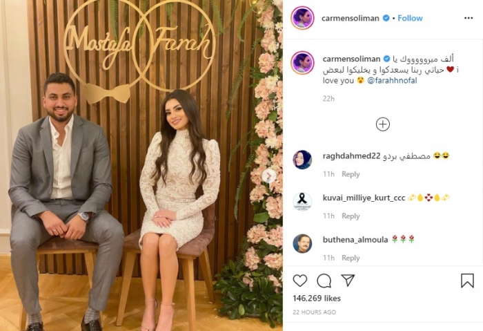 ونشرت كارمن صورًا لشقيقتها وخطيبها، عبر حسابها بموقع "إنستجرام"، وعلقت: "ألف مبروك يا حياتي، ربنا يسعدكوا ويخليكوا لبعض".