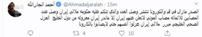 وقال في تغريدة عبر "تويتر" رصدها "المشهد العربي": "الصدر ما زال في قم والكورونا تنتشر وصل العدد والذي تتكتم عليه حكومه ملالي إيران وصل عدد المصابين ثلاثمائة مصاب الموتى لا تعلن عنهم إيران إلا ما ندر إيران معزولة من دول الخليج العزل الصحي الخليجي مبرر ملالي إيران عزلوا أنفسهم حتي لا يصابوا بالكورونا".