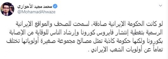 وقال في تغريدة عبر "تويتر" رصدها "المشهد العربي": "لو كانت الحكومة الإيرانية صادقة، لسمحت للصحف والمواقع الإيرانية الرسمية بتغطية انتشار فيروس كورونا وإرشاد الناس للوقاية من الإصابة بكورونا ولكنها حكومة كاذبة تمثل مصالح مجموعة صغيرة أولوياتها تختلف تماماً عن أولويات الشعب الإيراني".