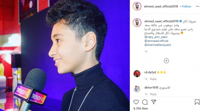 وشارك "سعد" جمهوره عبر "انستجرام"، صورة لرابي عمرو سعد، وعلق عليها قائلًا: "مبروك اكتر واحد موهوب في عائلة سعد، رابي عمرو سعد علي فيلم صندوق الدنيا ومبروك لكل الابطال والصناع".