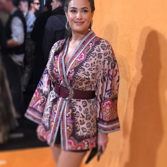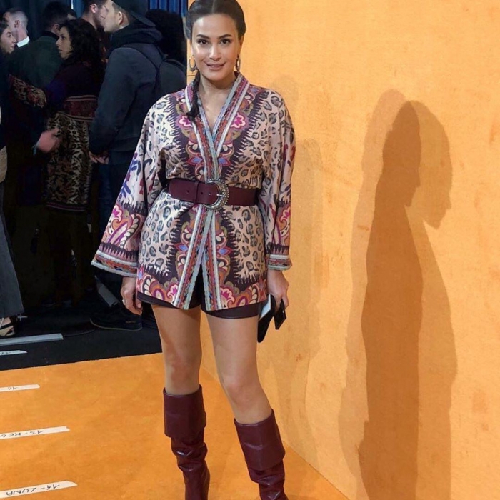 هند صبري بإطلالة مختلفة لحضور عرض أزياء دار إترو بميلانو (صور)