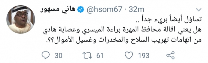 وكتب مسهور، في تغريدة له عبر موقع التواصل الاجتماعي تويتر، تابعها المشهد العربي: "تساؤل أيضاً بريء جداً .. هل يعني إقالة محافظ المهرة براءة الميسري وعصابة هادي من اتهامات تهريب السلاح والمخدرات وغسيل الأموال؟؟".