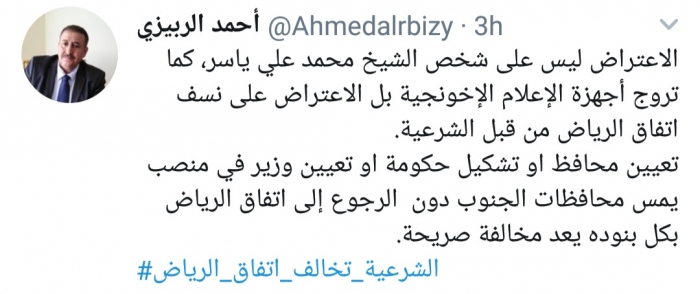 وكتب الربيزي، في تغريدة له عبر موقع التواصل الاجتماعي تويتر، تابعها المشهد العربي: "الاعتراض ليس على شخص الشيخ محمد علي ياسر، كما تروج أجهزة الإعلام الإخونجية بل الاعتراض على نسف اتفاق الرياض من قبل الشرعية".