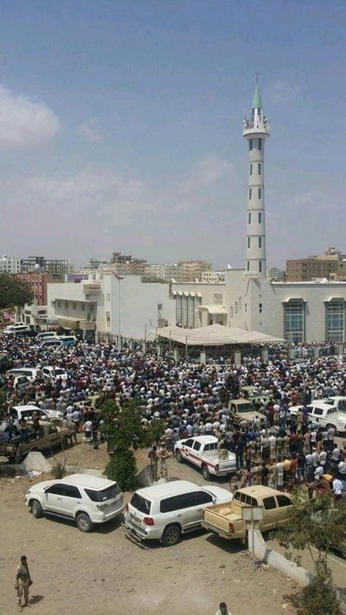 وانطلق موكب التشييع في مشهد مهيب، من مسجد الفردوس، وصولا إلى مقبرة الحسوة، بمشاركة جموع غفير من المواطنين وقيادات من قوات الحزام الأمني.