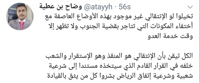 وكتب بن عطية، في تغريدة له عبر موقع التواصل الاجتماعي تويتر، تابعها المشهد العربي: "تخيلوا لو الانتقالي غير موجود بهذه الأوضاع العاصفة مع اختفاء المكونات التي تتاجر بقضية الجنوب ولا تظهر إلا وقت خدمة العدو".
