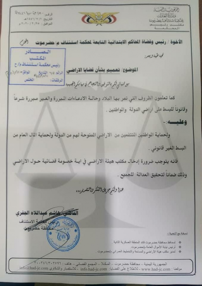 وجه رئيس محكمة استئناف محافظة حضرموت، القاضي هاشم عبداللاه الجفري، قضاة المحاكم الابتدائية في حضرموت، إلى إدخال الهيئة العامة للأراضي والمساحة في أي خصومة حول الأراضي.