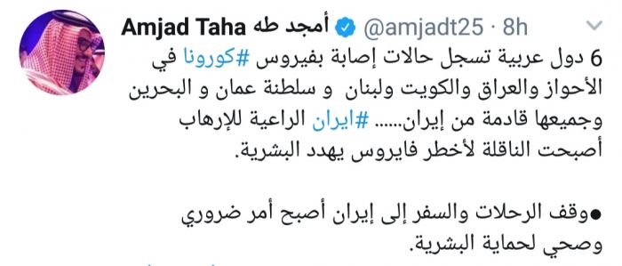 وكتب أمجد طه، في تغريدة له عبر موقع التواصل الاجتماعي تويتر، تابعها المشهد العربي: "6 دول عربية تسجل حالات إصابة بفيروس كورونا في الأحواز والعراق والكويت ولبنان وسلطنة عمان والبحرين وجميعها قادمة من إيران".