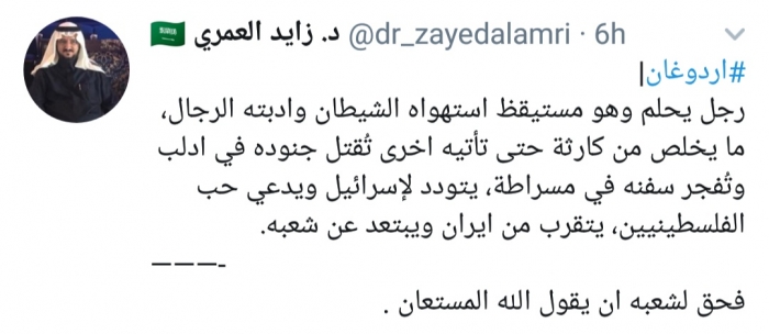 وكتب العمري، في تغريدة له عبر موقع التواصل الاجتماعي تويتر، تابعها المشهد العربي: "أردوغان.. رجل يحلم وهو مستيقظ استهواه الشيطان وأدبته الرجال".