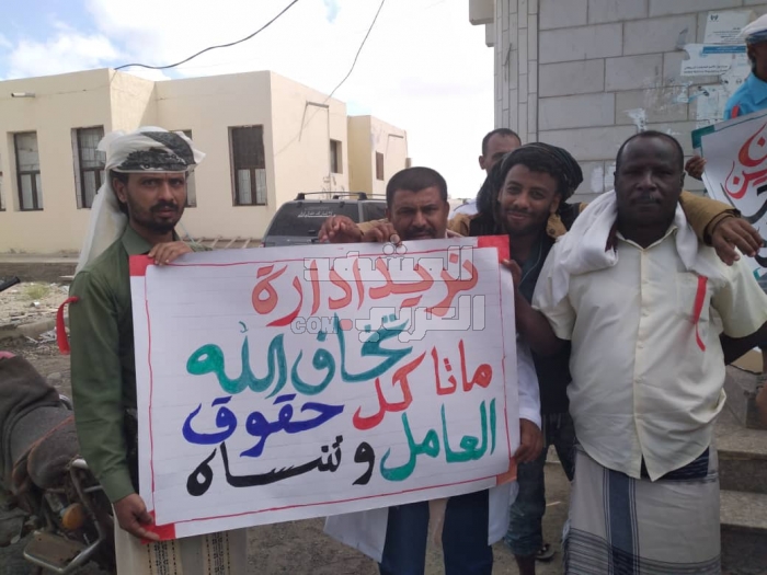 ورفع الموظفون، خلال وقفة احتجاجية أمام مستشفى زنجبار، اليوم الثلاثاء، لافتات حمراء وشعارات دعوا فيها إلى التحقيق معهما في قضايا فساد.