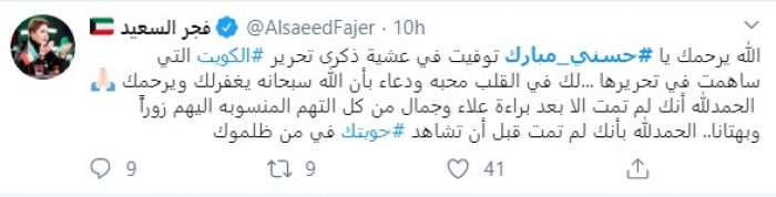 نعت الإعلامية الكويتية فجر السعيد، الرئيس المصري الأسبق محمد حسني مبارك، عبر حسابها الشخصي بموقع التدوينات القصيرة "تويتر"، وكتبت قائلة:" الله يرحمك يا حسني مبارك توفيت في عشية ذكرى تحرير الكويت التي ساهمت في تحريرها ...لك في القلب محبه ودعاء بأن الله سبحانه يغفرلك ويرحمك الحمدلله أنك لم تمت الا بعد براءة علاء وجمال من كل التهم المنسوبه اليهم زوراً وبهتانا.. الحمدلله بأنك لم تمت قبل أن تشاهد حوبتك في من ظلموك".
