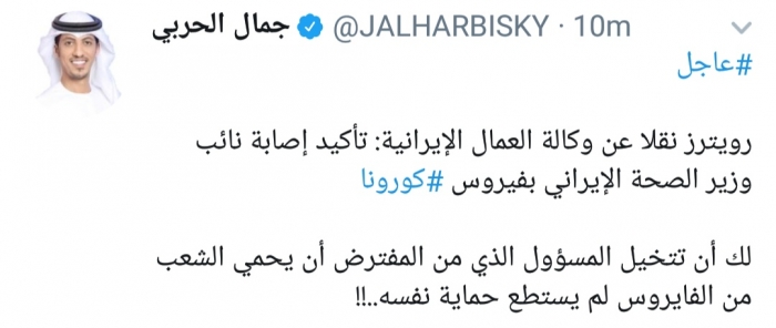 وكتب الحربي، في تغريدة له عبر موقع التواصل الاجتماعي تويتر، تابعها المشهد العربي "رويترز نقلا عن وكالة العمال الإيرانية: تأكيد إصابة نائب وزير الصحة الإيراني بفيروس كورونا".