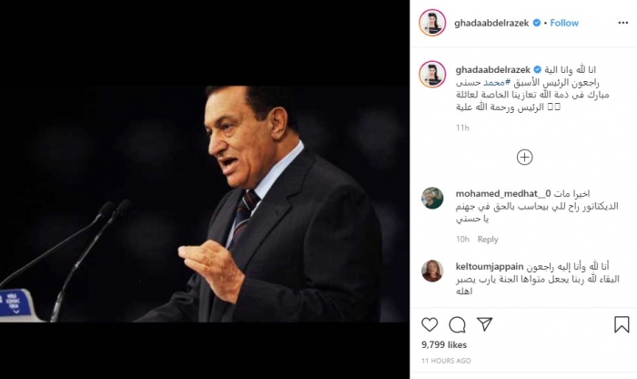 ونشرت غادة صورة للرئيس الراحل، عبر حسابه الرسمي بموقع "إنستجرام"، وعلقت :" إنا لله وإنا إليه راجعون، الرئيس الأسبق محمد حسني مبارك في ذمة الله تعازينا الخاصة لعائلة الرئيس ورحمة الله عليه".