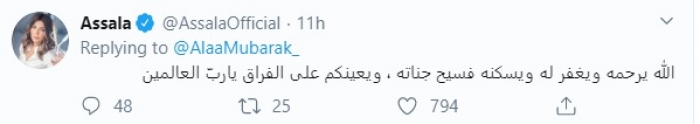 ونشر علاء نجل الراحل محمد حسني مبارك، مقطع فيديو، عبر حسابه بموقع "تويتر"، وعلقت أصالة:" الله يرحمه ويغفر له ويسكنه فسيح جناته ، ويعينكم على الفراق ياربّ العالمين".