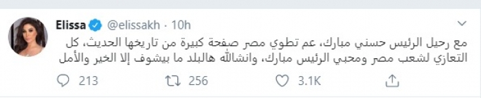 وكتبت إليسا عبر حسابها بتويتر :" مع رحيل الرئيس حسني مبارك، عم تطوي مصر صفحة كبيرة من تاريخها الحديث، كل التعازي لشعب مصر ومحبي الرئيس مبارك، وانشالله هالبلد ما بيشوف إلا الخير والأمل".