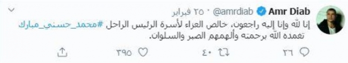 نعى النجم المصري عمرو دياب، عبر حسابه الرسمي بموقع تويتر، الرئيس المصري الأسبق محمد حسني مبارك، الذي رحل عن عالمنا اليوم الثلاثاء.