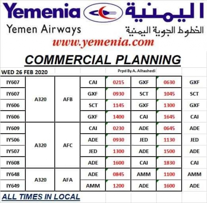 ينشر "المشهد العربي" مواعيد رحلات طيران اليمنية غداً الأربعاء، الموافق 26 فبراير 2020.