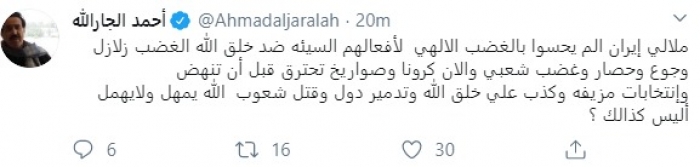 وقال في تغريدة عبر "تويتر" رصدها "المشهد العربي": "ملالي إيران ألم يحسوا بالغضب الإلهي لأفعالهم السيئة ضد خلق الله الغضب زلازل وجوع وحصار وغضب شعبي والآن كرونا وصواريخ تحترق قبل أن تنهض وانتخابات مزيفه وكذب علي خلق الله وتدمير دول وقتل شعوب الله يمهل ولا يهمل أليس كذالك؟".