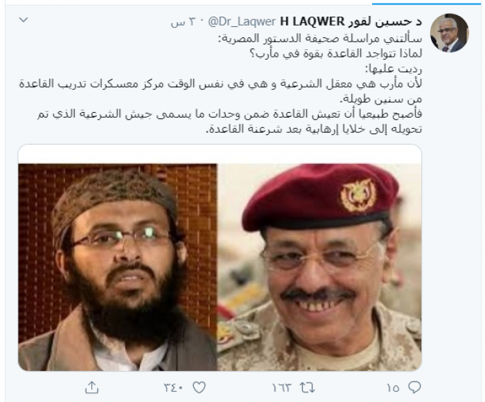وكتب في تغريدة عبر "تويتر" رصدها "المشهد العربي": "سألتني مراسلة صحيفة الدستور المصرية: لماذا تتواجد القاعدة بقوة في مأرب؟.. رديت عليها: لأن مأرب هي معقل الشرعية وهي في نفس الوقت مركز معسكرات تدريب القاعدة من سنين طويلة. فأصبح طبيعيًا أن تعيش القاعدة ضمن وحدات ما يسمى جيش الشرعية الذي تم تحويله إلى خلايا إرهابية بعد شرعنة القاعدة".