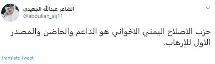 وقال في تغريدة عبر "تويتر" رصدها "المشهد العربي": "حزب الإصلاح اليمني الإخواني هو الداعم والحاضن والمصدر الأول للإرهاب".