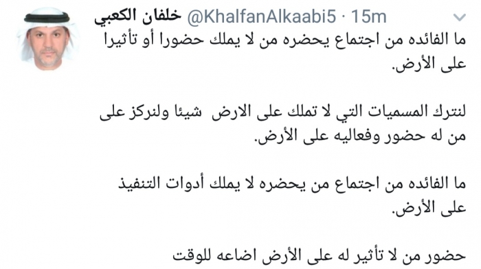 وتساءل الكعبي، في تغريدة له عبر موقع التواصل الاجتماعي تويتر، تابعها المشهد العربي: "ما الفائدة من اجتماع يحضره من لا يملك حضورا أو تأثيرا على الأرض؟".