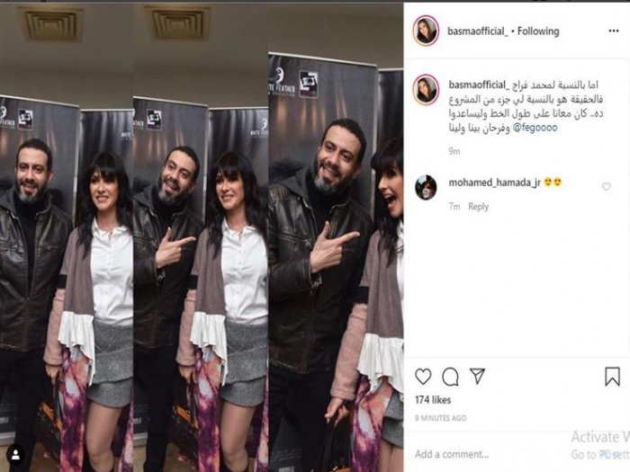 وكتبت بسمة في تعليقها على الصورة :"أما بالنسبة لمحمد فراج فالحقيقة هو بالنسبة لي جزء من المشروع ده. كان معانا على طول الخط وفرحان بينا ولينا".