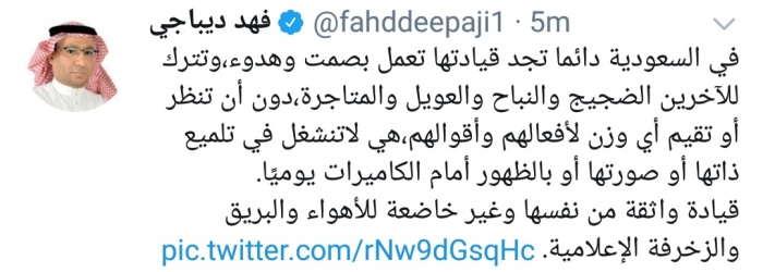 وكتب ديباجي، في تغريدة له عبر موقع التواصل الاجتماعي تويتر، تابعها المشهد العربي: "في السعودية دائما تجد قيادتها تعمل بصمت وهدوء، وتترك للآخرين الضجيج والنباح والعويل والمتاجرة، دون أن تنظر أو تقيم أي وزن لأفعالهم وأقوالهم".