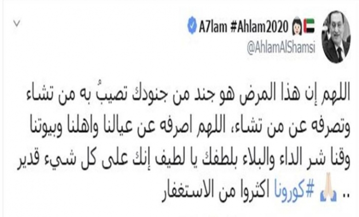 طالبت الفنانة الإماراتية أحلام جمهورها بكثرة الاستغفار بسبب فيروس "كورونا"، الذي انتشر مؤخرًا في دولة الإمارات، داعية من الله أن يذهب هذا المرض عن من ابتلى به.