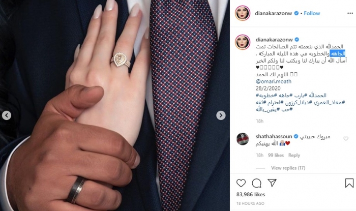وظهر في الصور كفي ديانا ومعاذ بعد ارتداء خاتم "الخطوبة"، وكتبت الأولى في تعليقها "الحمد لله الذي بنعمته تتم الصالحات تمت الجاهة والخطوبة في هذه الليلة المباركة، أسأل الله أن يبارك لنا ويكتب لنا ولكم الخير.. اللهم لك الحمد".