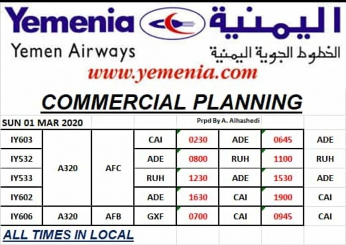 تنطلق خمس رحلات جوية، غدا الأحد، لطيران اليمنية، إلى القاهرة والرياض، من مطاري العاصمة عدن الدولي وسيئون.