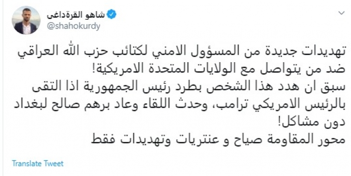 وقال في تغريدة عبر "تويتر" رصدها "المشهد العربي": "تهديدات جديدة من المسؤول الأمني لكتائب حزب الله العراقي ضد من يتواصل مع الولايات المتحدة الأمريكية! سبق أن هدد هذا الشخص بطرد رئيس الجمهورية إذا التقى بالرئيس الأمريكي ترامب، وحدث اللقاء وعاد برهم صالح لبغداد دون مشاكل! محور المقاومة صياح وعنتريات وتهديدات فقط".